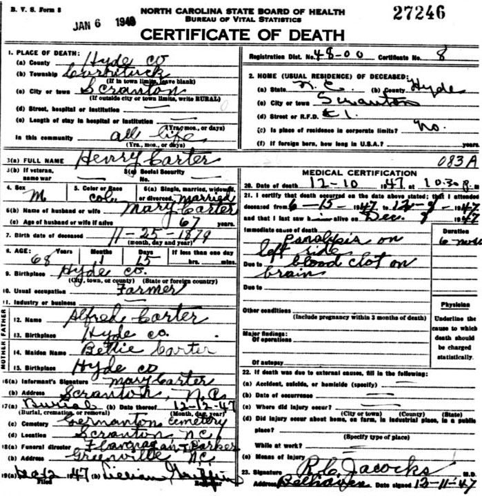 | Carter, Henry | Nov. 25, 1879 | Dec. 10, 1947 | Alfred Carter & Bettie ______ [Death Certificate] | |