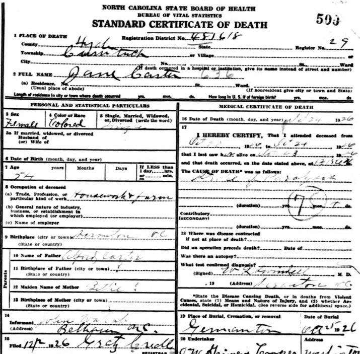 | Carter, Jane | c1872 | Oct. 24, 1926 | Alfred Carter & Bettie ______ [Death Certificate] | |