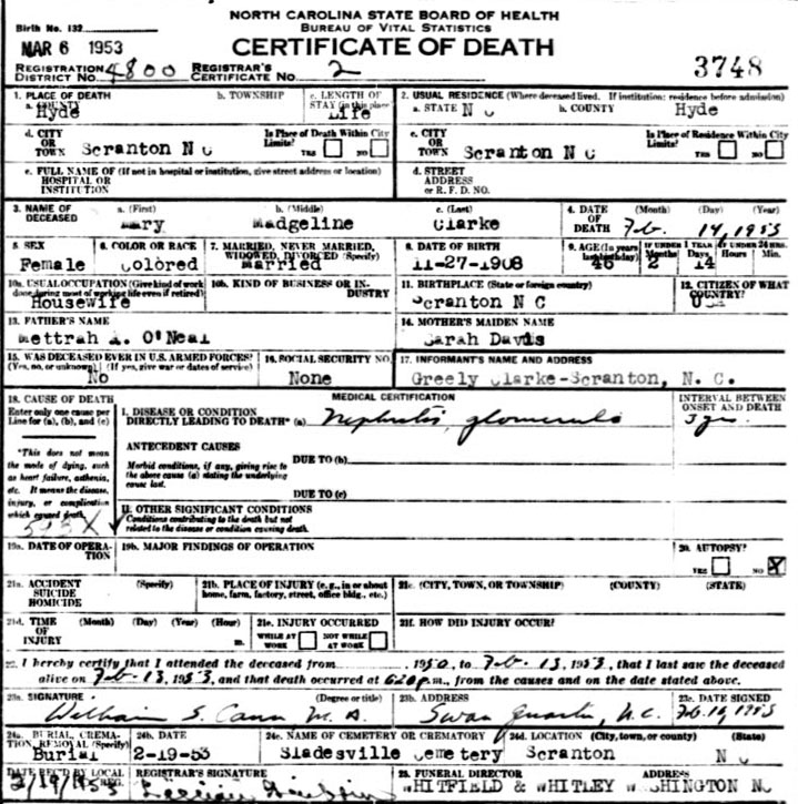 | Clarke, Mary Madgeline | Nov. 27, 1908 | Feb. 14, 1953 | Daughter of Mettrah O'Neal & Sarah Davis; married Greely Clarrke Nov. 28, 1926 [Death Certificate] | |