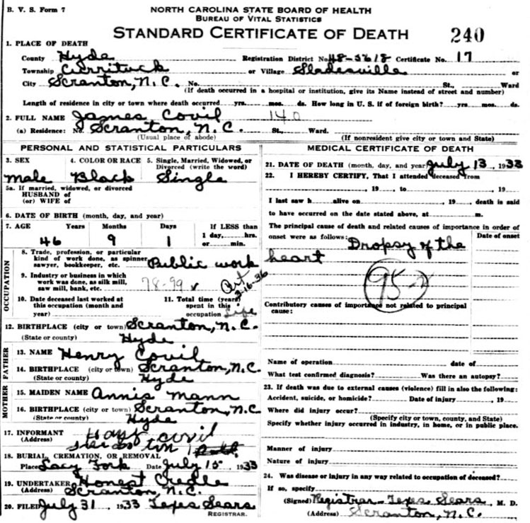 | Covil, Mammie | Oct. 21, 1907 | Dec. 29, 1977 | Gone But Not Forgotten | [Hyde Co Death Certificate Index] [Longshot] |
