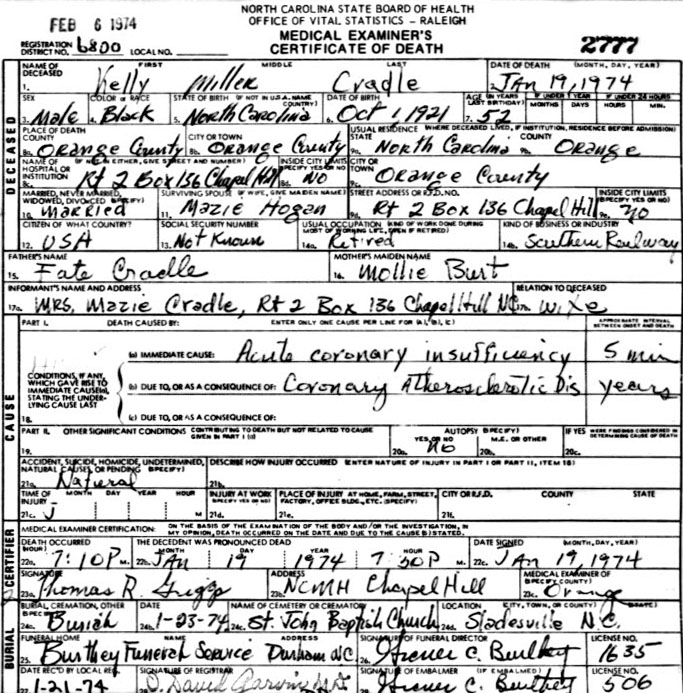 | Credle, Kelly Miller | Oct. 1, 1921 | Jan. 19, 1974 | Loving Father, Faithful Friend | [Death Certificate states surname as Cradle] |