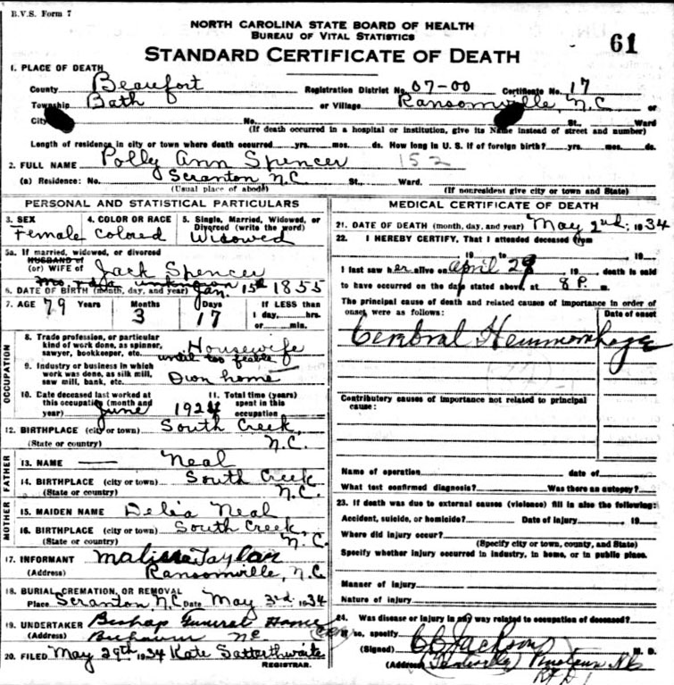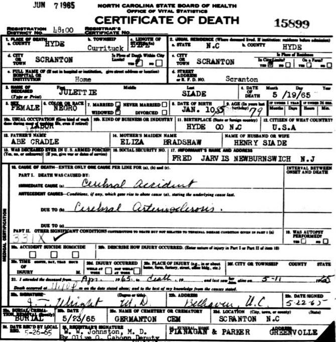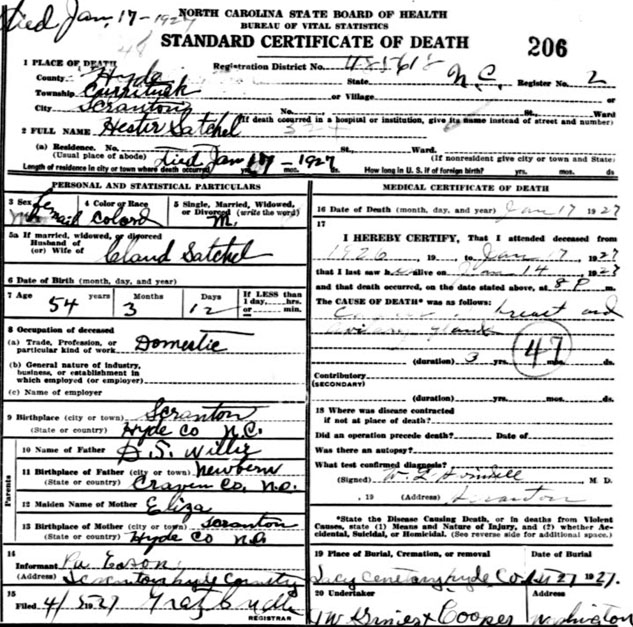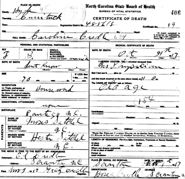 | Credle, Caroline | c1847 | Oct. 31, 1917 | Daughter of Moses Satchel & Hester ______ [Death Certificate] | |