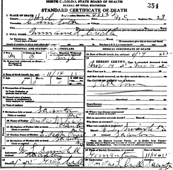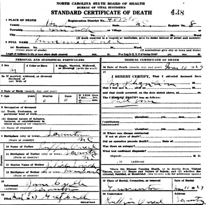| Credle, infant male | Nov. 14, 1925 | Nov. 14, 1925 | Son of Ondas L. Credle & Lida (or Lilla) M. O'Neal [Death Certificate] | |