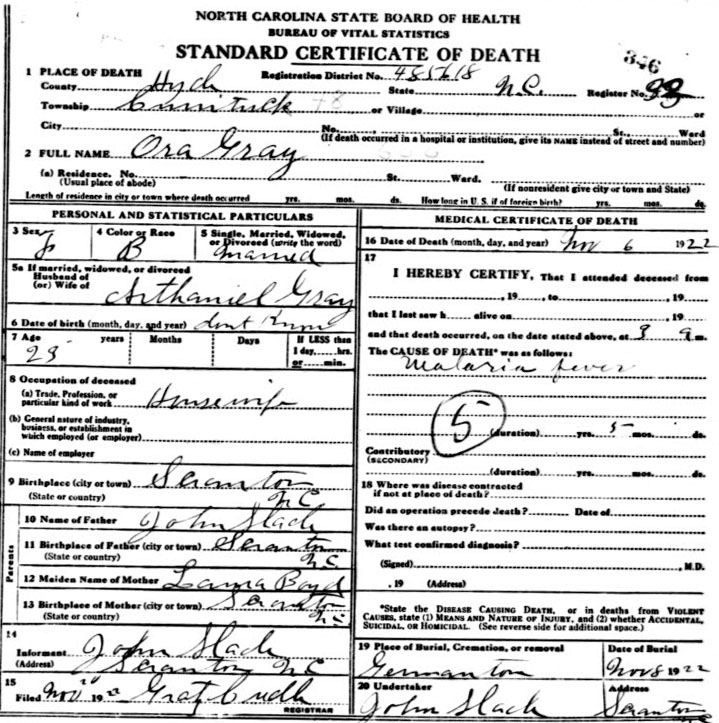 | Gray, Ora | c1899 | Nov. 6, 1922 | Daughter of John Slade & Laura Boyd [Death Certificate] | |