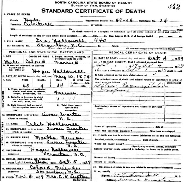 Caleb Hollowell & Martha Benson & husband of Hagar [Death Certificate] |