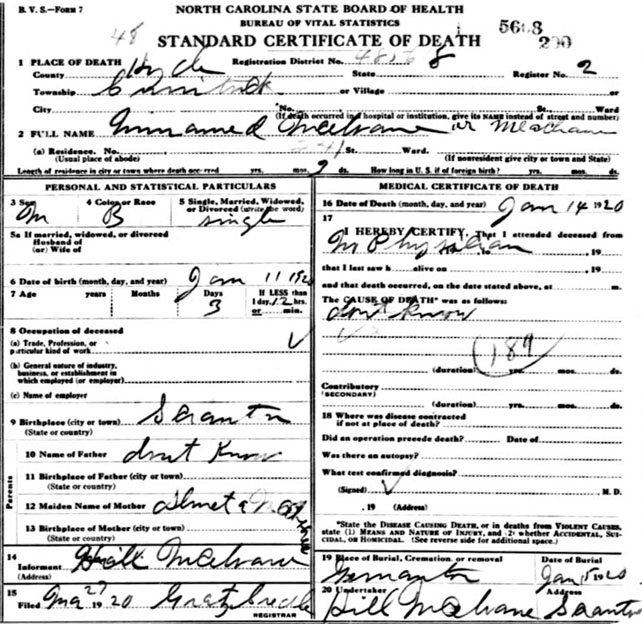 | McElvane, infant male | Jan. 11, 1920 | Jan. 14, 1920 | son of Almeta McElvane [Death Certificate] | |