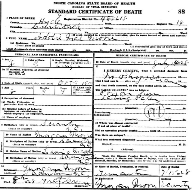 | Moore, Addie Mae | Oct. 9, 1919 | July 14, 1928 | Daughter of Morgan Moore & Louisa Mackey [Death Certificate] | |