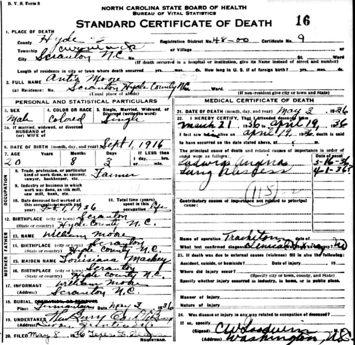 | Moore, Antio?/Antis? | Sept. 1, 1916 | May 3, 1936 | Son of William Moore & Louisiana Mackey [Death Certificate] | |