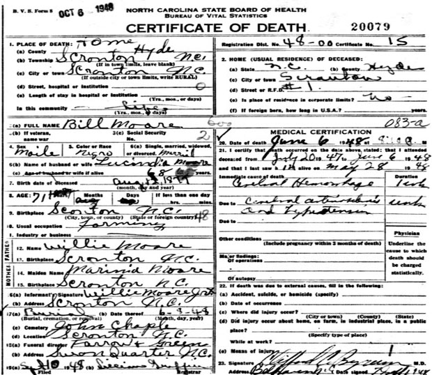 | Moore, Bill | Aug. 12, 1877 | June 6, 1948 | Son of Willie Moore & Marina ______ [Death Certificate] | |