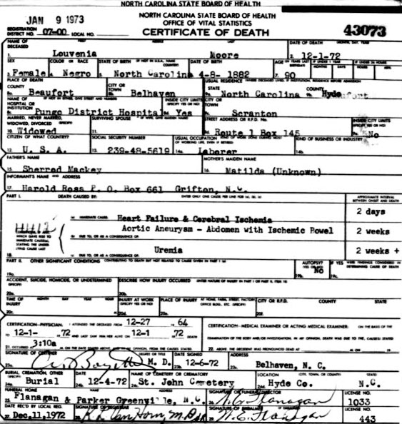| Moore, Louisana | Oct. 2, 1881 | Apr. 16, 1949 | Daughter of Shade Mackey & Matilda _____ [Death Certificate] | |