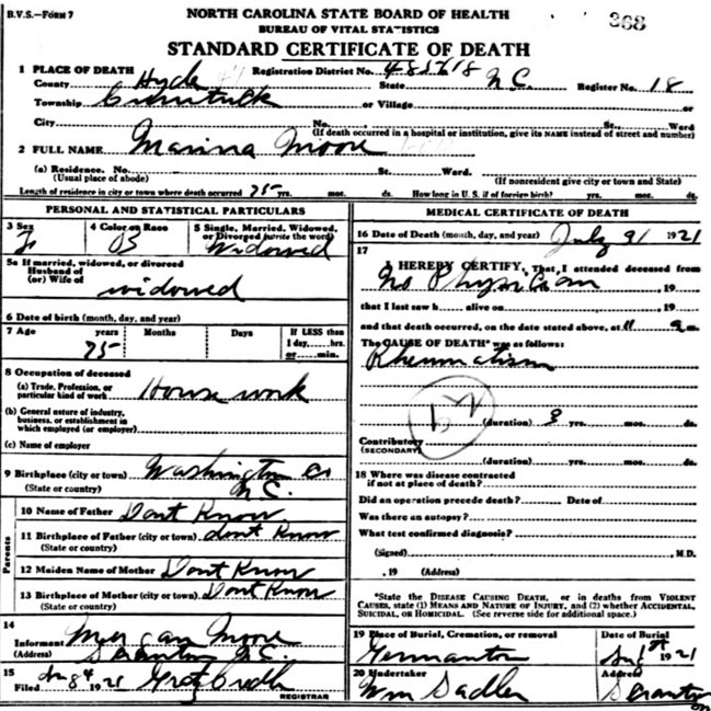 | Moore, Marina | c1846 | July 31, 1921 | [Death Certificate] | |