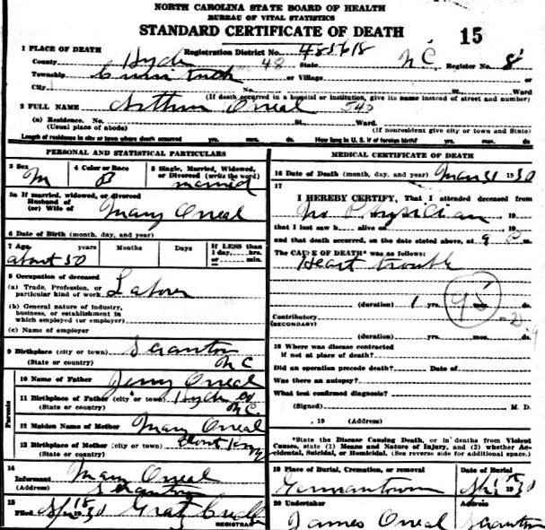 | O'Neal, Arthur | c1880 | Mar. 31, 1930 | Son of Jerry O'Neal & Mary _____ [Death Certificate] | |
