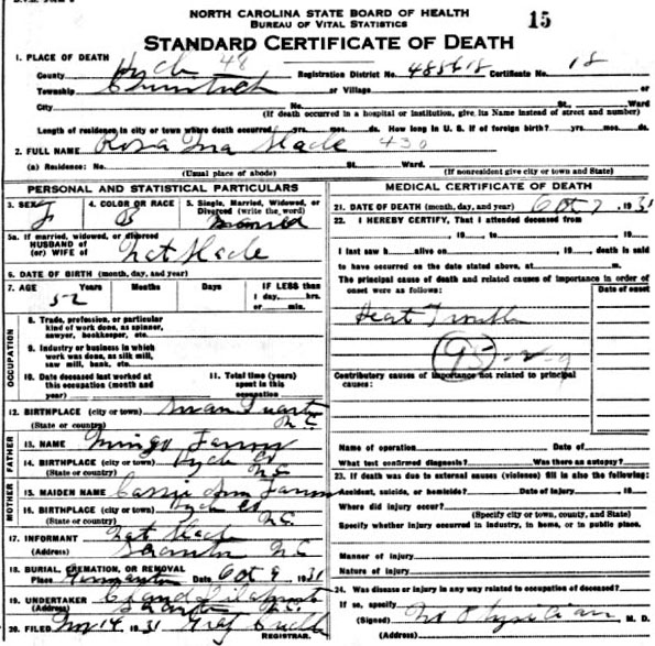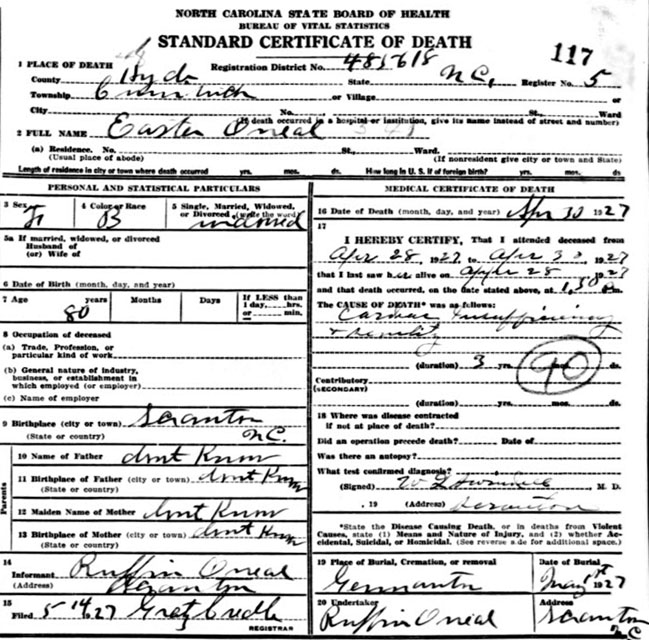 | O'Neal, Easter | c1847 | Apr. 30, 1927 | [Death Certificate] | |