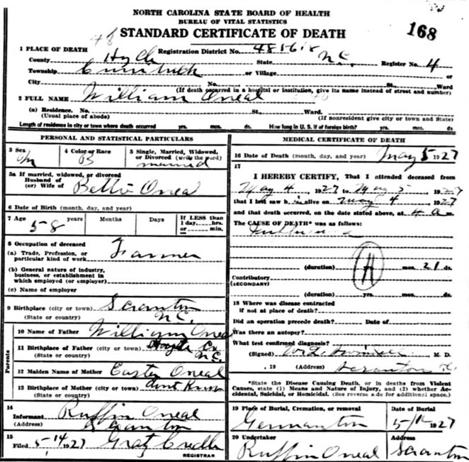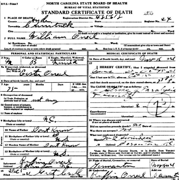 | O'Neal, William | c1846 | Nov. 16, 1921 | Husband of Easter O'Neal [Death Certificate] | |
