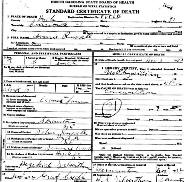| Russell, Annie | c1905 | Nov. 3, 1922 | Daughter of John Russell & Jennie Credle [Death Certificate] | |