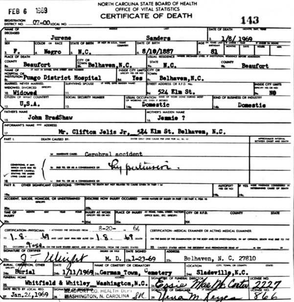 | Sanders, Jurene | c1888 | Jan. 8, 1969 | Daughter of John Bradshaw & Jennie ______ [Death Certificate] | |
