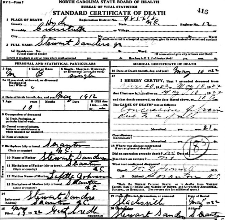 | Sanders[on], Stewart Jr. | May 1912 | May 10, 1922 | Son of Stewart Sanderson & Lafetta Johnson [Death Certificate] | |