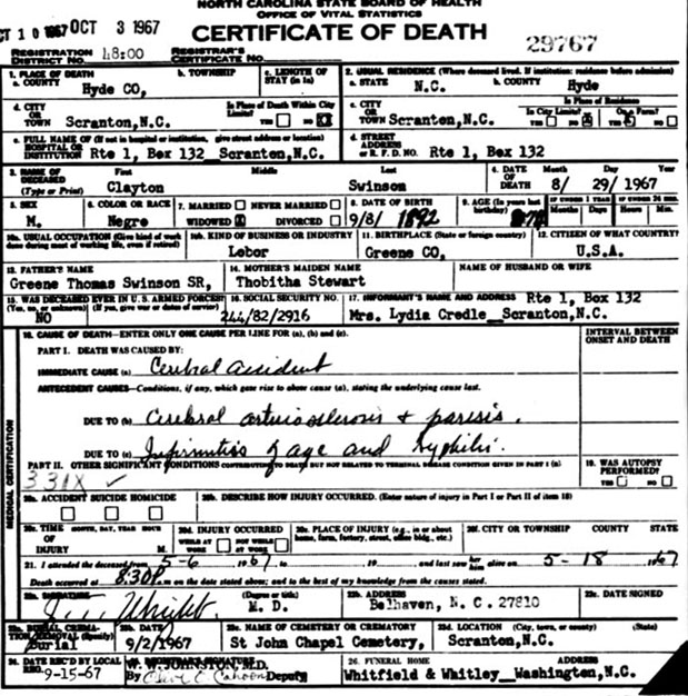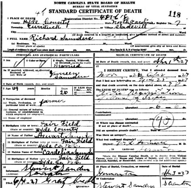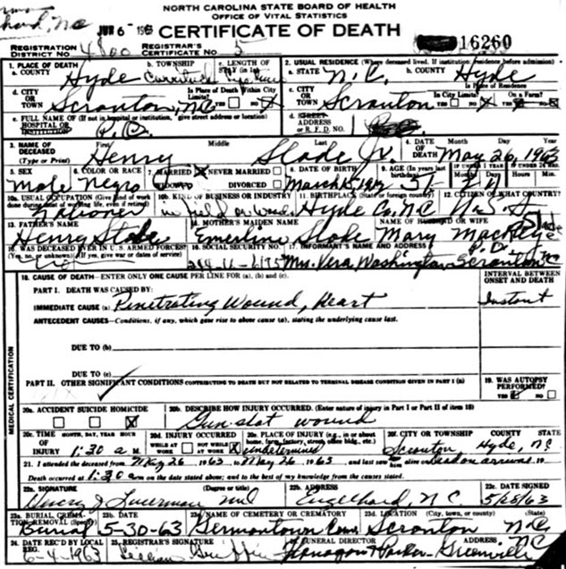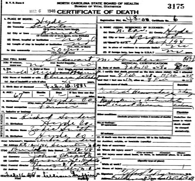 | Davis, Allen Jr. | Sept. 11, 1948 | Sept. 12, 1978 | [Hyde Co. Death Certificate Index] [Longshot] | |
