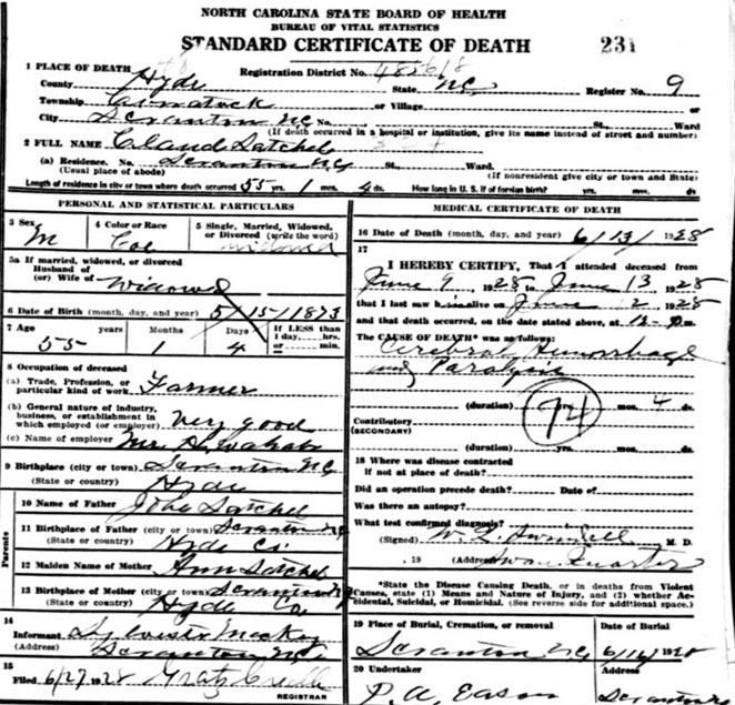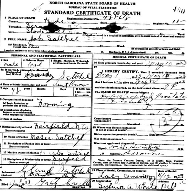 | Satchel, Claud | May 15, 1873 | June 13, 1928 | Son of Jobe Satchel & Ann ______ [Death Certificate] | |