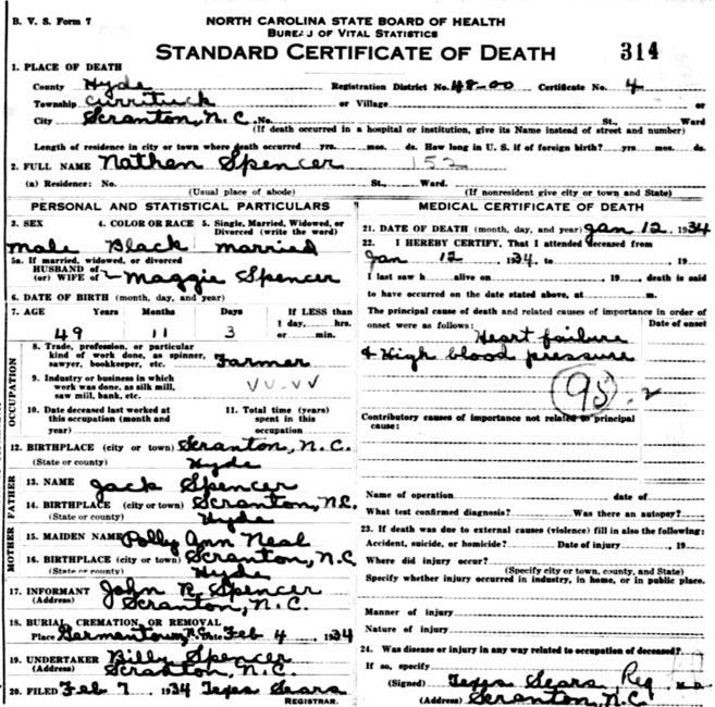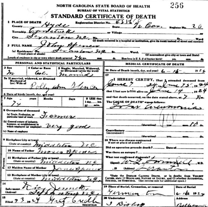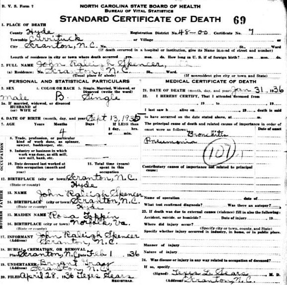 | Spencer, John Raleigh | Oct. 18, 1897 | Aug. 29, 1979 | Rest in Peace | [Hyde Co. Death Certificate Index] [Longshot] |