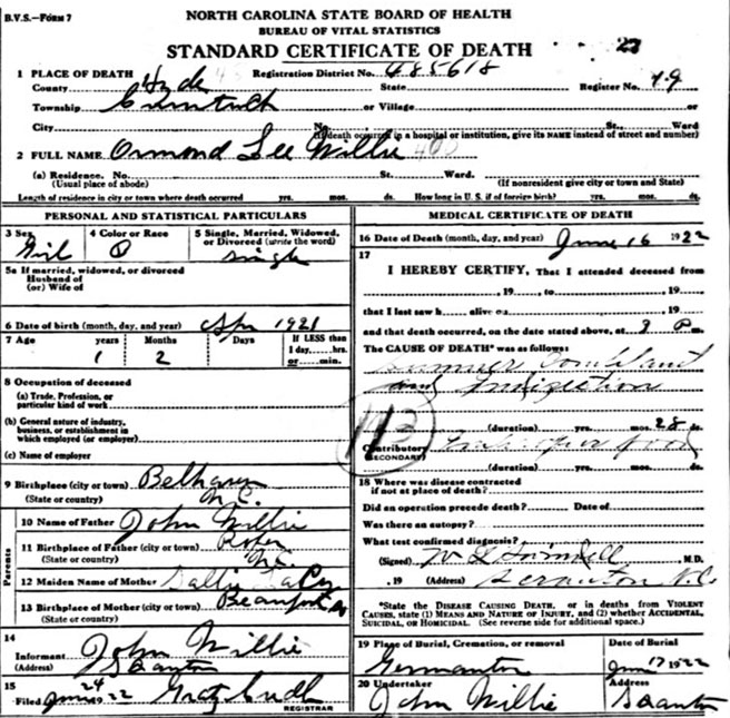 | Willie, Ormond Lee | Apr. 1921 | June 16, 1922 | Son of John Willie & Sally Lacy [Death Certificate] | |