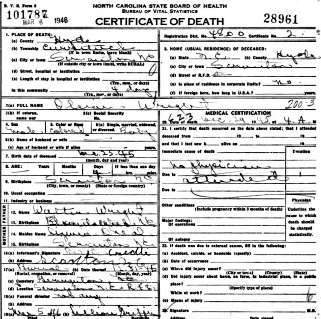 | Wright, Oleian? | Dec. 25, 1945 | Dec. 29, 1945 | Son of Walter Wright & Lizenia O'Neal [Death Certificate] |