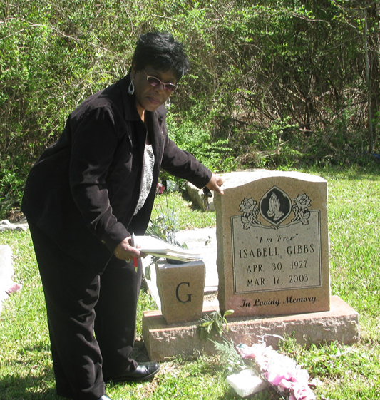 Isabell [see another photo] [photo of Maldine Wallace with tombstone] |