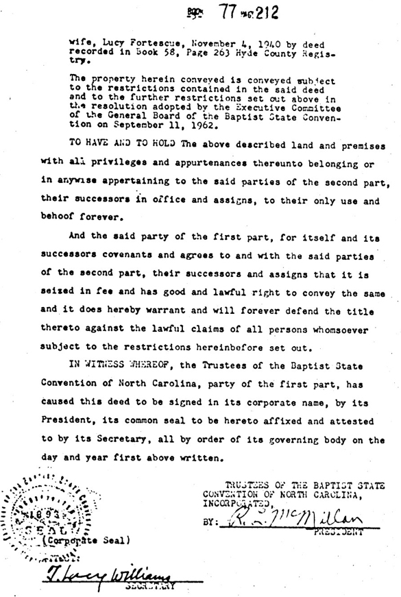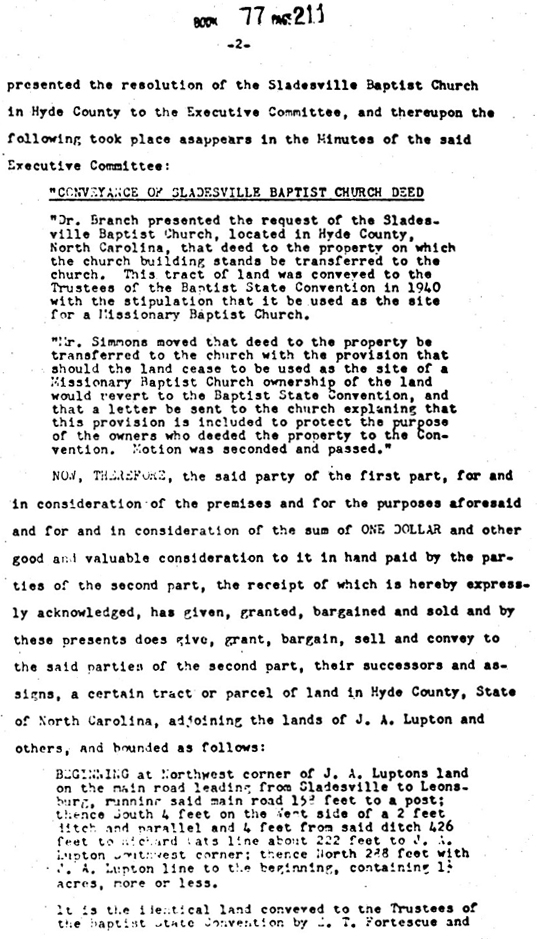 research will result in a complete history of this denomination. On November 4, 1940, Z.T. Fortescue and Lucy Fortescue deeded a plot of land in Sladesville to the Baptist State Convention for the purpose of that denomination. This deed is recorded in Deed Book 58, page 263, Register of Deeds Office, Hyde County Courthouse, Swan Quarter, North Carolina. In 1962, was was in keeping with the policies of the church organization, upon the successful functioning of a local denomination, the church property was deeded by the Baptist State Convention of North Carolina to Harold Spencer, Lloyd Williams, Staton Sadler, Eugene Midyette, William S. Cutrell, and Travis Flowers, acting as Trustees for the Sladesville Baptist Church. This deed is recorded in the Register of Deeds Office, Hyde County Courthouse, Deed Book 77, pages 210 through 213. [Only pages 210-212 are seen below.] The church is a white frame structure located near the village of Sladesville on state highway number 1142. The church is surrounded by a small cemetery. The membership of the church numbers approximately _______ (nothing filled in).