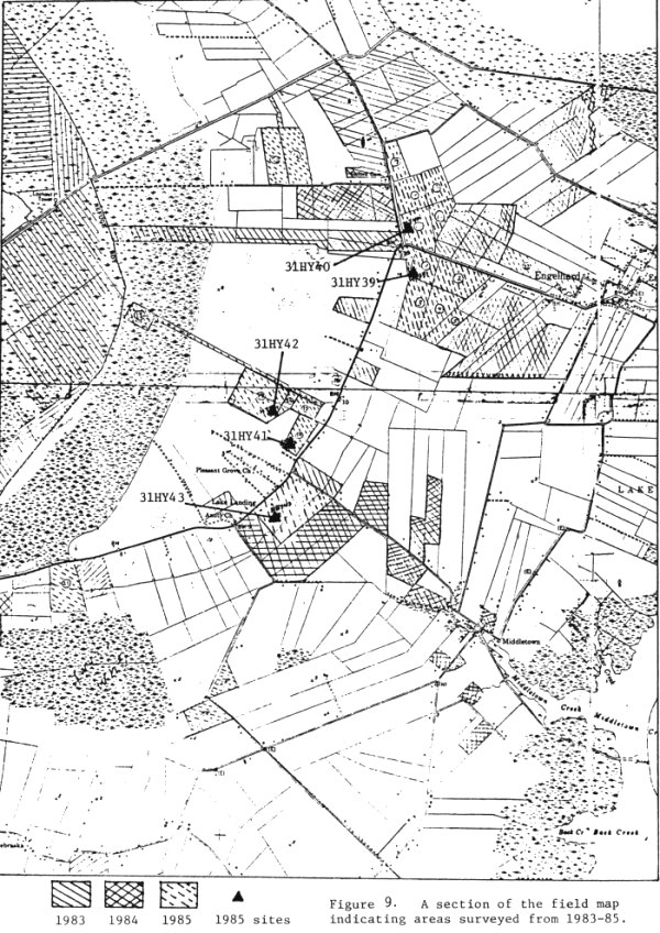Figure 9: A section of the field map indicating areas surveyed from 1983 to 1985