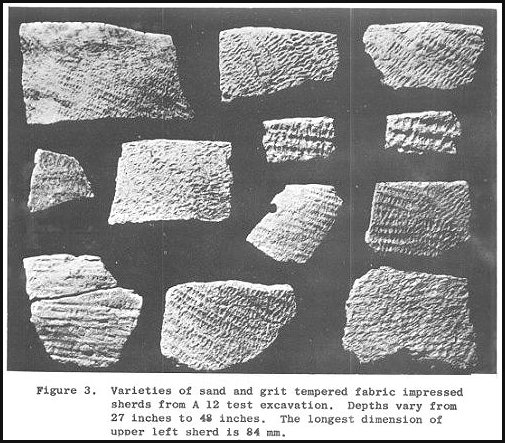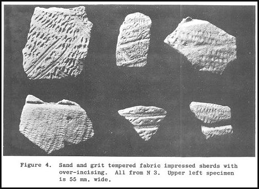 Fabric-impressed surface finish constitutes about 60 per cent of all grit-tempered sherds. Variation in form and application is not so pronounced as might be expected. The most common fabric impression is a rather coarse plain plaiting as illustrated in Figure 3. There is little doubt but that a flexible cord was laced about a rather large and rigid warp element, and the resulting "cloth" or "basketry" was pressed against the moist clay vessel, perhaps to add strength until dry. Sometimes the weft elements have parted or slipped along this stick (?) or reed (?) and its bare impression may be seen among the cords (Figure 3, lower left). Occasionally the cord is quite fine; more often it is coarse---perhaps 2 mm. in diameter. Most of the sherds readily fall into the category called Dunlap Fabric Marked but they would just as easily meet the descriptive requirements of several other fabric- impressed types (Sears and Griffin, 1950).