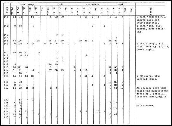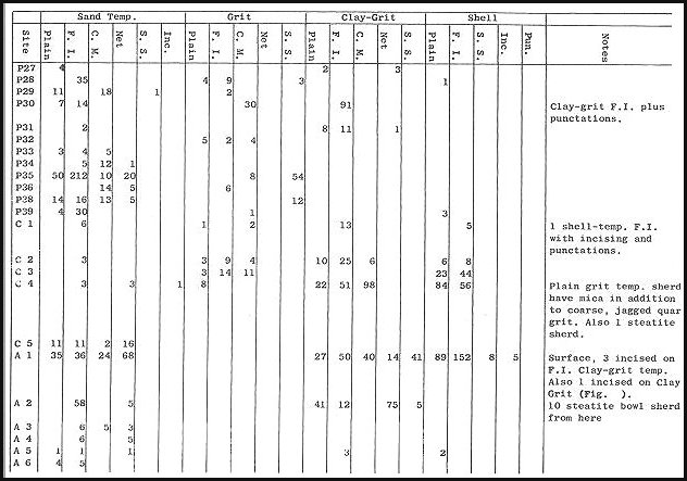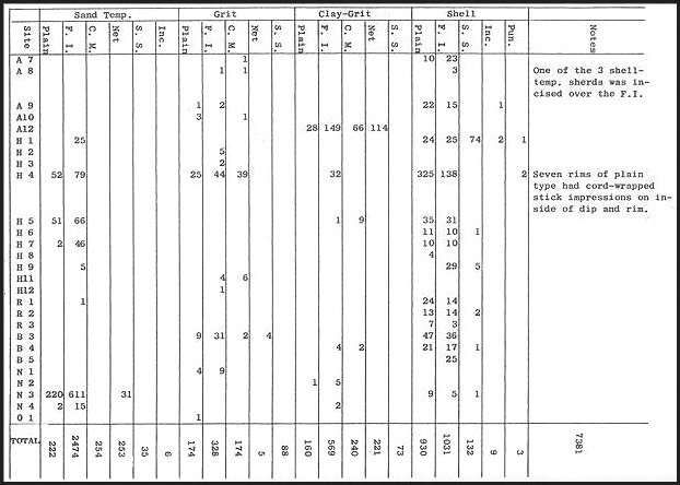 An examination of the summary of the distribution of the sherd types throughout the various sites in the study area shows there are two major divisions in the ceramic remains (Table 1). These two categories are based on temper, namely, shell or non-shell. Finer distinctions go beyond these points but in gross analysis this is the significant feature of the pottery. If this is true, the presence of shell tempering must have both temporal and spatial significance. This premise will be better tested with some acquaintance with the pottery typology.