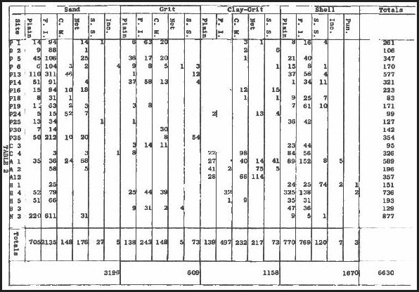 It is an unfortunate and altogether unavoidable aspect of the scientific method that before one may validly term a certain operation or factor unnecessary, the factor must be considered in some test situation. Thus we may judge from past experience that two major categories of pottery suffice. However, in order to compare our findings with neighboring materials the non-shell-tempered pottery was analyzed by first subdividing into sand, coarse grit, or sherd and grit temper (Tables 1 and 2).