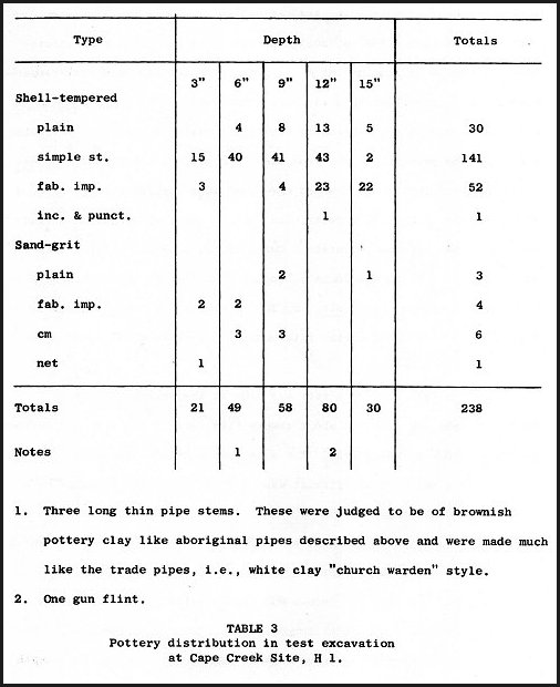 (Page 102) A check of Table 1 shows that of the A 12 surface sherds none was shell tempered nor were any simple-stamped sherds found. These two facts demonstrate the cultural position of the site to be quite different from H 1 and other Banks. There is a definite decline in the use of net-impressed pottery that suggests the site to have a history that spans several centuries but persisted until near the eighteenth century.
