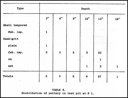 There is no doubt about the cultural relations of site P 1. It is typical of the many shell heaps as may be observed from Tables 1 and 2. Shell-tempered pottery may be present but it is always a minority ware. Further, the shell-tempering technique appears to be a late arrival, or at least more recent, an these sites.