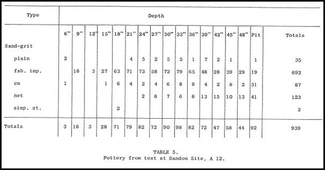 The site that gave greatest evidence of depth was the Bandon Site, A 12, on Chowan River. Also this site was farthest northwest of all examined. Thus it might show contacts with cultures identified in the interior.