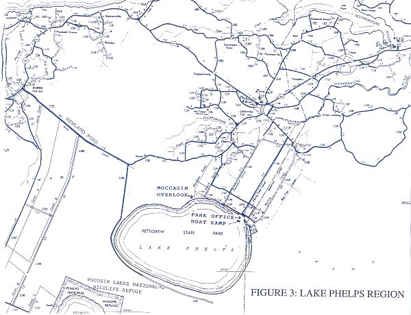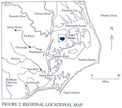 Lake Phelps is a unique, rain-fed depression, located on the Albermarle-Pamlico Peninsula of eastern North Carolina. This kidney-shaped pocosin is but one of several shallow, natural lakes known as "Carolina Bays," three of which, Lakes Phelps, Pungo, and Mattamuskeet, have hosted frequent and sometimes intensive prehistoric occupation. Lake Phelps is the second largest lake in the state in area, and is situated on the coastal plain less than forty miles west of Cape Hatteras. This fresh-water lake, which is seven miles in length and five miles in width, covers an area of nearly 25 square miles (or more precisely 16,600 acres), and is principally ensconced in Washington County, although its western fiinge abutts Tyrell County. The entire lake, however, and a substantial portion of its northern shoreline, falls within the jurisdiction and protection of Pettigrew State Park.