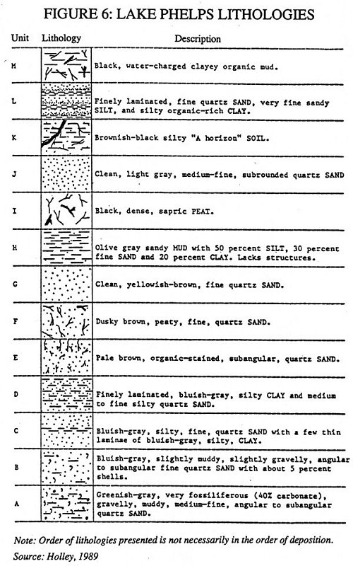 Lake Phelps is directly underlain by Pleistocene marine and estuarine deposits. The uppermost marine unit likely correlates with the Flanner Beach Formation (189,000 B.P.). Estuarine muds and sands overlie the marine unit. The upper surface of the estuarine muds and sands is an unconformity upon which most of the lake sediments are deposited. The oldest terrestrial deposit above the unconformity that can be dated by the C-14 method is an organic stained sand (>38,000 B.P.). This sand unit is confined to the lake basin and may represent an early lake shore deposit.