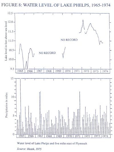 Currently, no natural streams either feed into or drain from the lake, and the only natural discharge appears to be overbank flooding along the low northwest shore, which ultimately reaches the Scuppernong River. It has been demonstrated by Heath that the primary source of water is from precipitation and overland flow, clear, and free of the tannic brown color that would signify ground water discharge from the surrounding peat deposits. This may be a modem circumstance produced by the existence of a perimeter canal which circles the lake from Big Point west and south to the southeast margin of the lake, which acts as an aquifer between lake and peat deposits.