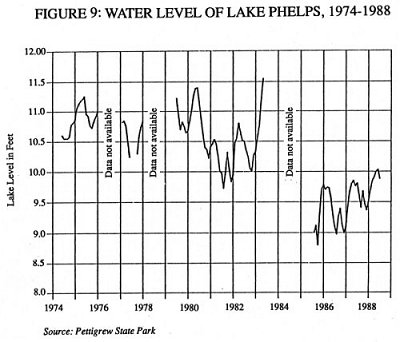 The modern lowered water table causes seasonal lake level fluctuations in response to evaporation and precipitation. These lake level fluctuations have developed modern terrace and wave cut platforms along the northern, eastern, and southeastern shores of the lake. In 1984, the lake experienced a historic maximum low stand. A drop of over two and a half feet of water was recorded as a result of a major peat and forest bum of 95,000 acres abutting the south and east shores and the necessity of pumping out lake water to staunch the fire. Nearshore erosion, owing to the lowered wave base, exposed for the first time prehistoric dugout canoes in the water and artifacts from settlement and camp sites along the northern lake rim. Between 1985 and the September 1992 survey the water has begun to return to its historic average, a fact determined by recordation of water levels carried out by Pettigrew State Park since mid-1985, and during testing in the 1992 survey. (Page 11)