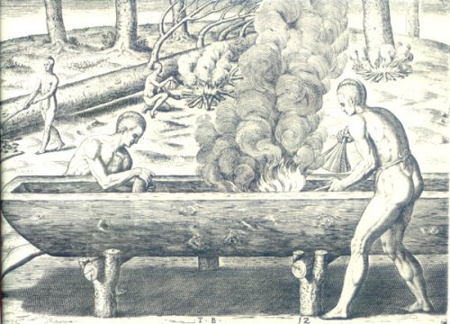 The naturalist artist John White, a first-hand observer of the Indian dugout canoe described the process of canoe manufacturing thus: