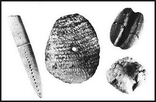 A polished stone object with 18 drilled depressions and a groove (left); a gorget made from a fabric impressed sherd (center); a grooved ceramic object (upper right); and an amorphouse fired clay piece (lower right). |