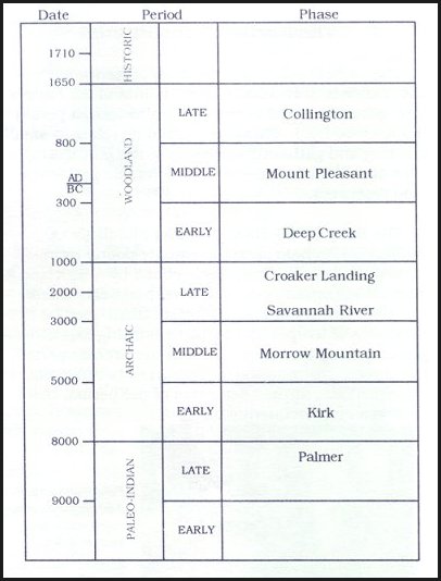 The canoes and other artifacts from Lake phelps represent a sequence of occupations at the lake which correlate with the general cultural history of northeastern North Carolina. That sequence is shown on the accompanying chart. What is known of the artifacts and lifeways of each phase in the sequence is described over the following the pages. (Page 5)