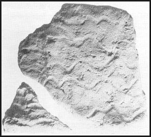 Two canoes, dated to 770 B.C. and 900 B.C. belong to the Deep Creek phase of the Early Woodland period (1000-300 B.C.). One of these canoes, shown on the front cover of this pamphlet was found with fragments of a ceramic pot approximately half inside and half outside the canoe. Apparently the vessel was dropped and hit the edge of the abandoned canoe. The ceramic vessel, which is of the type Deep Creek net impressed, and with the cord impressions from the string wrapped paddles, represent two of the main surface finishing techniques in the Deep Creek phase. Present also are ceramic vessels with fabric impressions on the exterior. The frequency of artifacts in the Deep Creek phase is approxixnately equal to that in the preceding Late Archaic period, and this phase is seen as a continuity in settlement types and adaptation from that period, although artifact types indicate new northern influences. (Page 8)