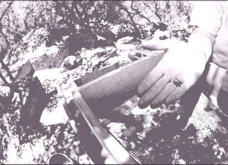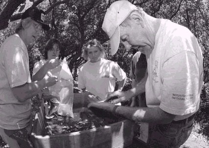 (Below) Dr. phelps examines objects which surface in a sifter, while discussing the findings.