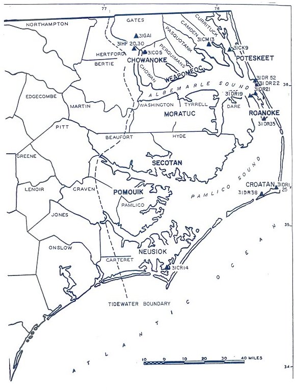 Conceived as a four-year endeavor, the project, as proposed, was based upon previous research in the northern Tidewater subregion of North Carolina, the homeland of the Carolina Algonkians (Figure 1), which had outlined the cultural-historical continuum ending with the Colington phase (phelps 1983), and summarized the distribution of Colington phase sites by localities, based in part on historic delineation of socio-political territories, and ranked them in order of importance and research potential (phelps 1982). In addition, the records and descriptions of native people, places and culture written by the Roanoke Voyagers (Quinn and Quinn 1982), the unique water color drawings of John White (Hulton and Quinn 1964), interpretations of these existing records (Quinn 1955), ethnohistoric accounts of the Carolina Algonkians (Mook 1944; Feest 1978) and earlier archaeological work (Haag 1958; Harrington l962) all provided the necessary background for this research.