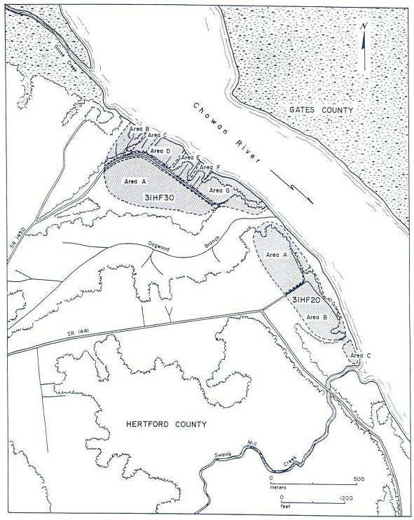 The first year of this project was designed to be a data-gathering segment with respect to the archaeological research, recognizing that the amount of information and specimens generated in the survey and excavations could not be adequately analyzed and published during the first year. The locations of sites worked during the year are shown in Figure 1. The major expenditure of effort in field research involved area excavations, tests and mapping of the mile-long site of Chowanoke (31HF20, 30), capital town of the Carolina Algonkian society of the same name, on the Chowan River in Hertford (Page 1) County.