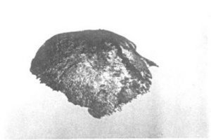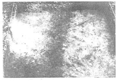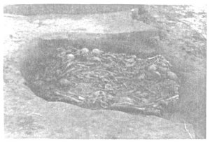 Burial 7 (Figure 8, right), similar to others previously reclaimed in the "cemetery" area at the north end of the site, contained approximately 30 individuals. Four of the crania showed evidence of red-staining from having been stored in mats or chests painted with red pigment. Our current assumption is that these individuals were stored in the rear of mortuary temples in the manner illustrated in John White's painting of such a temple at Secotan. Further, if Harriot's statement that only the nobility lived in the "towns", and the ossuaries only occur in the "town" sites, then this burial type may represent only the ruling and noble classes of Carolina Algonkian society.