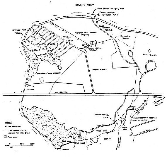 A search of the Fort Raleigh files produced slides of Harrington's unreported 1965 salvage of "Indian skeletons" near the old Dough farmstead at Dough's (or Etheridge's) Point (Figure 10). The excavation photos reveal what is probably an ossuary burial similar to those of the Colington phase, and the existence of this type of burial usually confirms a town location. Further, an 1840 shoreline survey map incorporated in Cheeseman's (1982) study shows the notation of "Indian grave yard," also at Dough's Point, presumably meaning the observed erosion of burials at some time around 1840. This, along with two features recorded in Harrington's 1965 field notes, but not excavated, certainly indicate the existence of a Colington phase town at or near Dough's Point. The point has lost considerable land in the erosion process, and specimens collected from the shoreline as far east as Crab Claw spit probably migrated with the sand from erosion of the point (phelps 1984) over time. While nothing may be left, and even the skeletons excavated by Harrington have not yet been located in the Smithsonian Institution collections, Dough's Point is the probable location of the 9-longhouse village visited by Barlowe in 1584, and relied upon by Lane in 1585-1586. Its location is approximately one-half mile from the Fort, sufficient area to support field systems, sufficiently distant from Lane's operation to be safe, but near enough for frequent and necessary exchange. Future research should include testing of the area between Dough's Point and the Elizabethan Gardens.