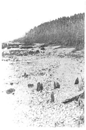 Work began at Northwest Point (Figure 10), on the property of Sandpiper's Trace, Inc., the traditional location of the Roanoke Village visited by Barlowe in 1584, and which supported Lane's colony in 1585-86 (Quinn 1955). Site 31DR19 was first recorded by Haag (1958), who collected ceramic specimens from the beach, as had earlier investigators. Five test squares were excavated by us in the vicinity of the point (Figure 10) with negative evidence of cultural material, and squares C-E outside the filled and modified section A of the property revealed that the bumic zone below the top sand layer lay directly at present sea level (Figure 11, right). Subsequently, a study of erosion patterns at Northwest point revealed that the dark gray humic layer, presumed to have been the exposed land surface in the 16th century, is being eroded at current sea level (Figure 11, left). Since all known and reported specimens have been reclaimed from the shore of Northwest Point, and our tests were negative, one can conclude that the site which once existed there is now completely eroded. All reported collections from the site have included both Mount Pleasant and Colington Phase ceramics, but given the elevation of the land with respect to current water level, the extent of erosion in response to rising water level, and the negative land evidence of cultural mafierial, the logical hypothesis is that this site was not inhabited in the 16th century, probably having been abandoned some centuries earlier because of low elevation and erosion. While the hypothesis will require more exacting information and correlations of elevation, sea level rise, and rates of erosion, I believe that it will stand the test.