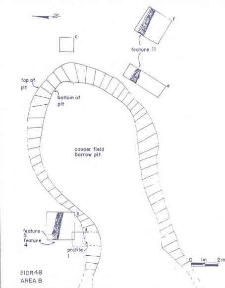 A report of previous exposure of "Indian skeletons" in the old Cooper Field borrow pit (Figure 13, top left) occasioned excavations there (Figures 10, 12), but the only material found was an aboriginal milling stone, 19th century scatter, and a ditch line traced east and west of the borrow pit. No artifacts were reclaimed from the ditch although its fill and outline are very obvious (Figure 13, bottom), and its date and relationships remain unknown. In addition to the excavations, a 19th century cemetery belonging to the Midgett family was mapped, photographed and recorded.
